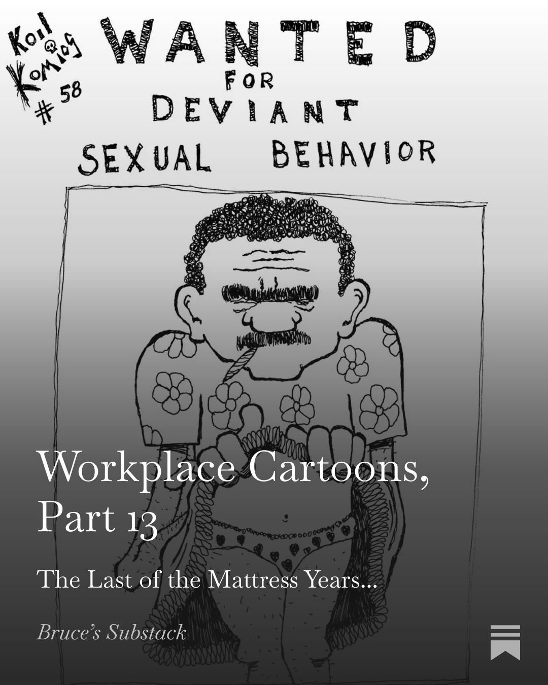 My latest Substack is the final chapter of my mattress making cartoons. I was there awhile, so there were a lot of them over the years. Click here to suffer [...]