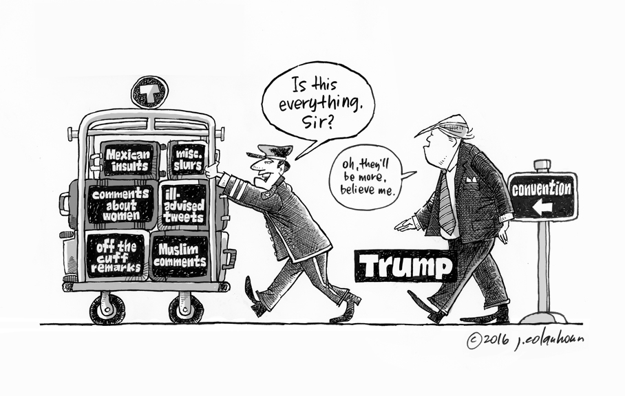 Donald Trump has been the subject of a few recent assignments- great fun to draw and entertaining to watch. It’s a little frightening to see how quickly he has gone from an easily-dismissed novelty to the presumptive Republican nominee. I kept changing the action of his supporters as Trump went from one outrageous statement to the next. Below is an earlier version taking off on the Megyn Kelly flap concerning past misogynistic statements: