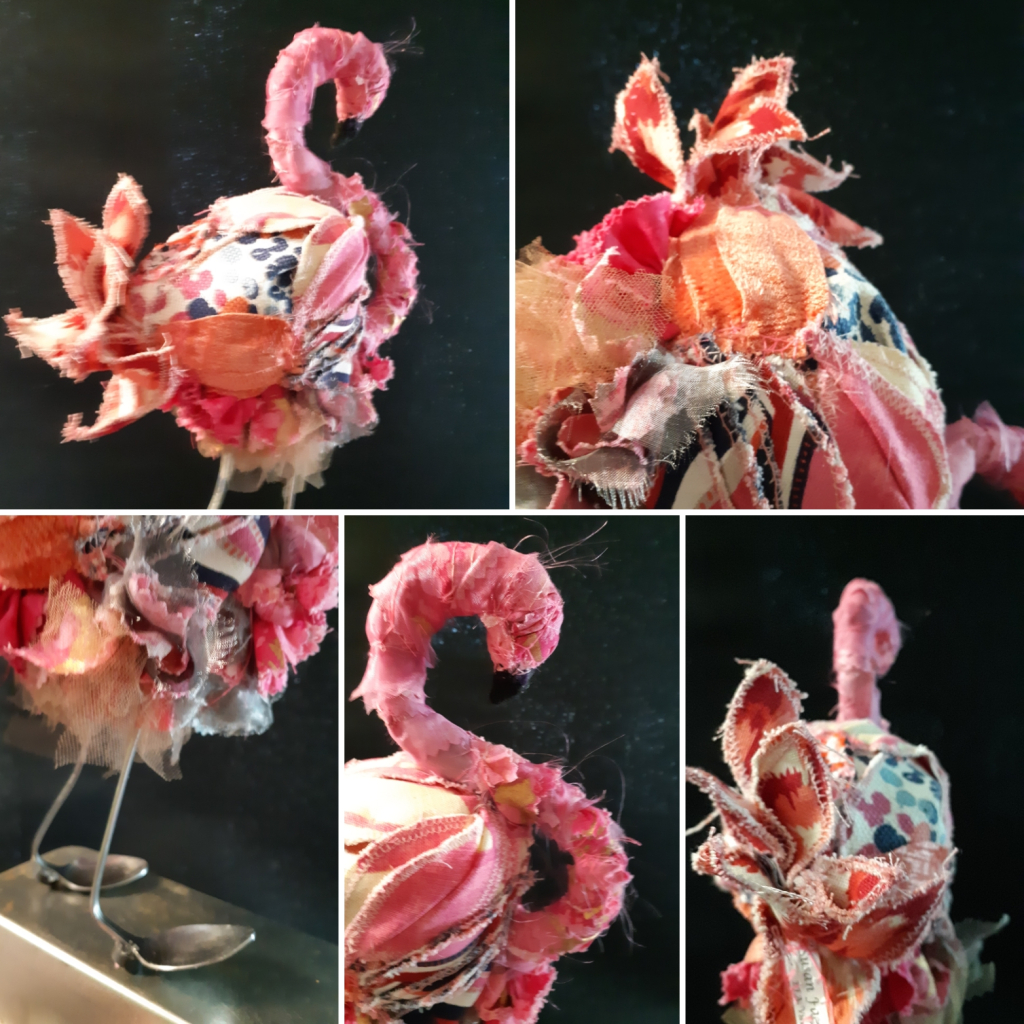 My process of creativity starts with an abundance of a colour or fabric texture, then, excitement takes over and a bird is formed. I work one bird at a time, which makes each bird uniquely “one of a kind”.