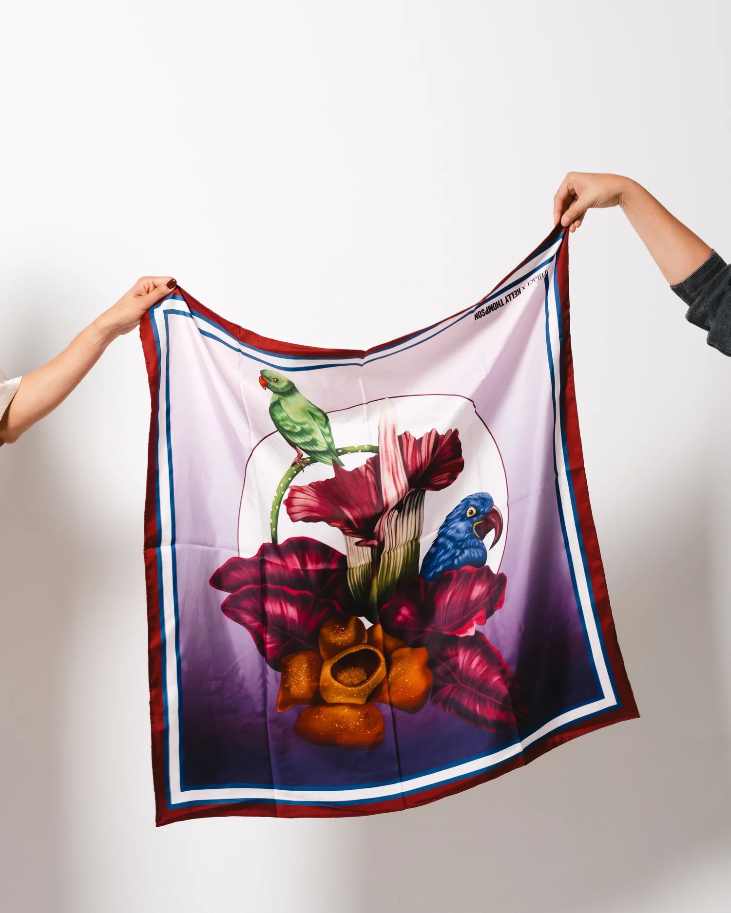 Plume is where vibrant color meets natural elegance. Exotic blooms burst across the scarf, interwoven with vivid parrots in rich emerald, violet, and crimson. The double-sided print gives depth to the botanicals and avian motifs, and Thompson’s expert brushwork brings it to life. wolfandbadger.com -