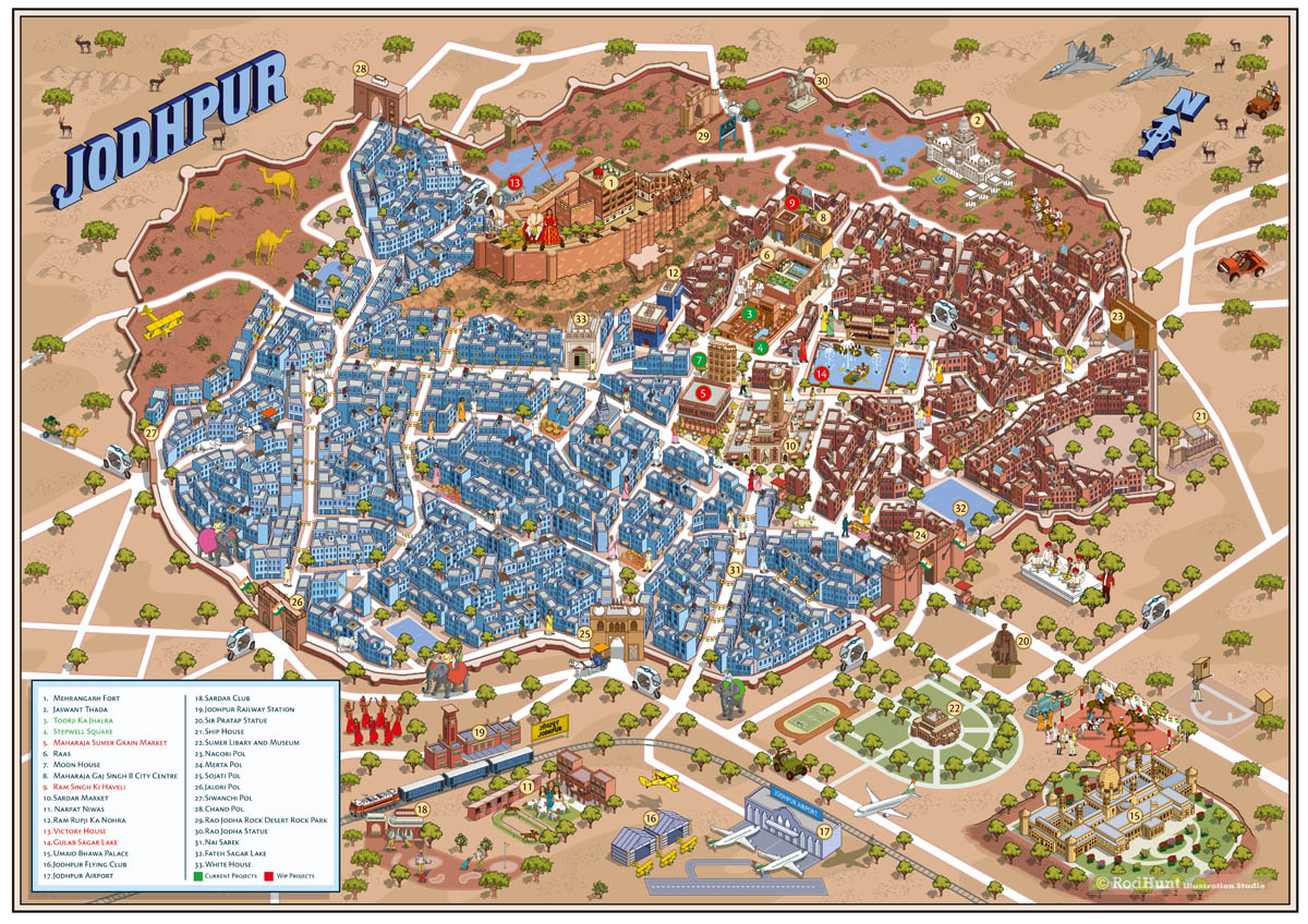 Rod Hunt was commissioned to create a detailed and expansive map of Jodhpur by The JDH, an Urban Regeneration Project that aims to restore the Walled City of Jodhpur to its former glory, breathing new life into its invaluable landmarks and livelihoods. The map of this ancient city needed to capture a sense of fantasy and magical reality that included Jodhpur’s key landmarks and monuments as well as elements of Jodhpur’s rich culture, architecture and landscape. Situated on the eastern edge of the Great Indian Thar Desert, Jodhpur was founded in AD 1459 by the warrior Rathore Rajput Chief, Rao Jodha. The second largest of Rajasthan’s great cities, it is a bustling microcosm watched over by the mighty colossus of Mehrangarh Fort.