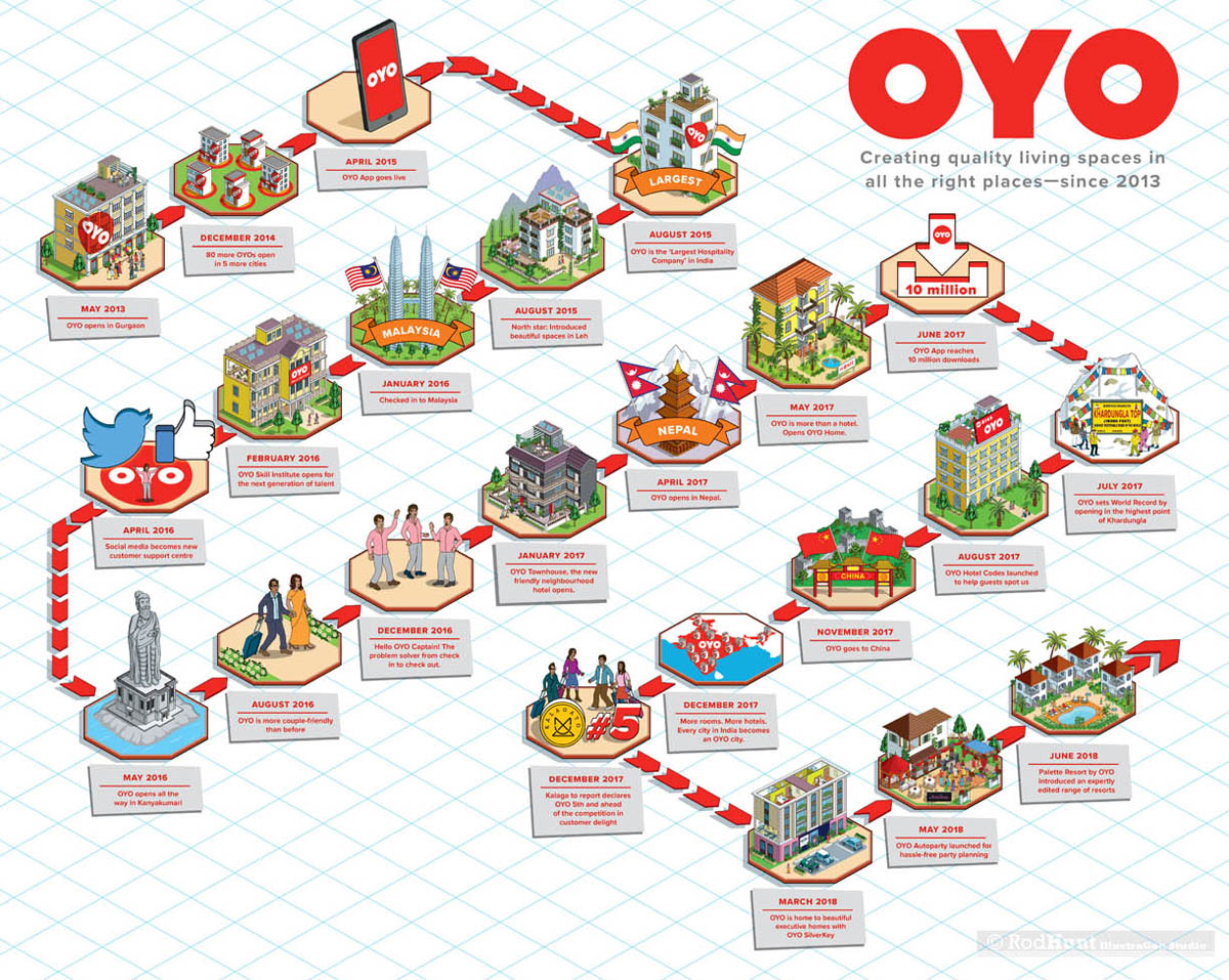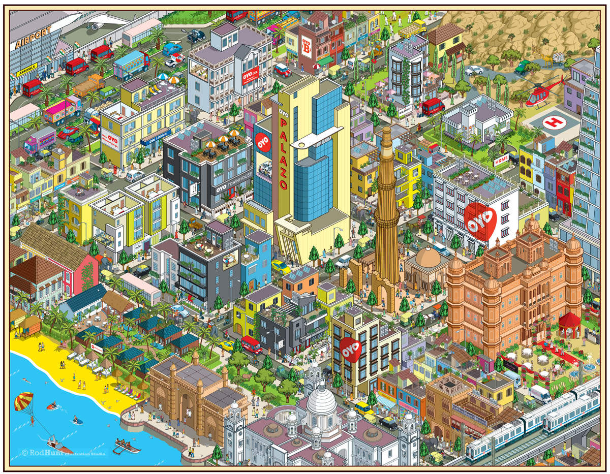 Rod Hunt was commissioned to create three illustrations to tell the story of OYO, showcasing the company, it’s services and bringing alive their history. Launched in 2013, OYO is India’s largest hospitality company. Its network currently spans over 200 Indian cities including all major metros, regional commercial hubs, leisure destinations, and key pilgrimage towns. It also has an international presence with hotels in Malaysia, Nepal and the UK.