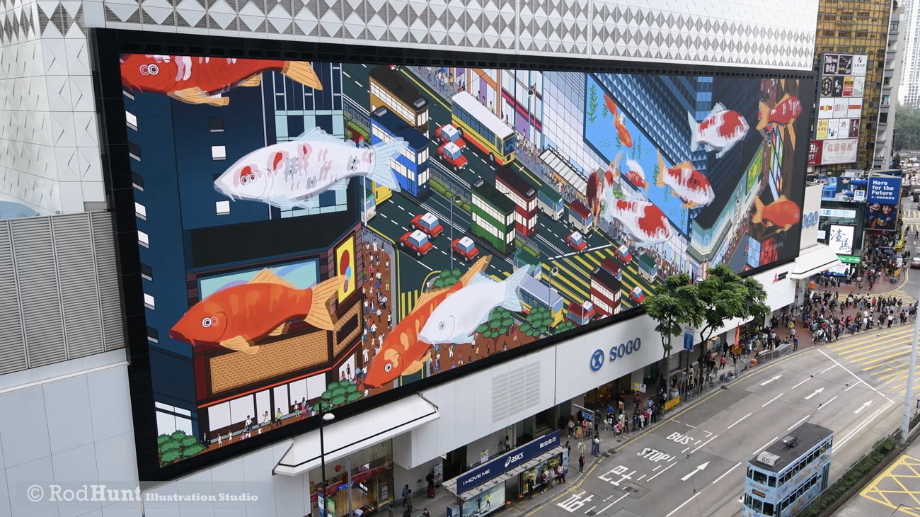 Rod Hunt was commissioned by the Sogo department store in Causeway Bay, Hong Kong to create an animated Bumper for CVISION, Asia Pacific’s largest high-resolution, LED wall. At over 72W x 19H meters in size, the media platform towers over one of the busiest, pedestrian intersections in the world. Sogo wanted the bumper to be a welcomed break from commercially-driven content and to draw inspiration from MTV and Adult Swim, the channels are known for their creative and expectation-defying bumpers. Rod was given granted artistic autonomy and thematic freedom to create an animation that showcased his creative vision and personality. Rod collaborated with animation company Bewilder.tv to bring his vision to life.