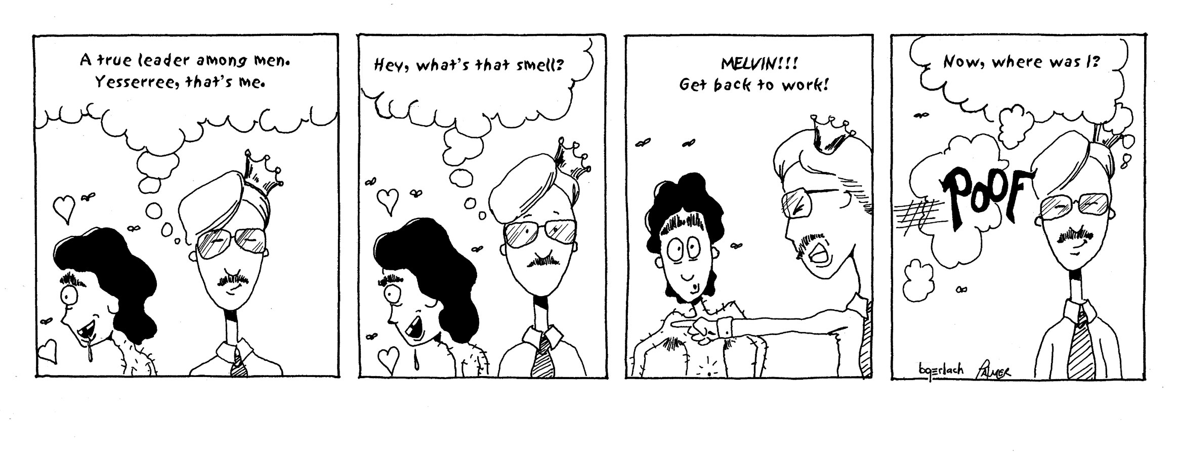 I haven’t posted one of these in awhile, so here is the 16th strip from a cartoon called Pipedreams that Darin Palmer created way back when, but had never shown. The strip follows the exploits of a collection of factory workers and was based entirely on the dump that we worked for at the time. Most of the names were changed to protect the guilty. Here, Melvin gets caught up in the plant supervisor King Koerber’s self admiration. Darin and I wrote these together and I penciled them and he inked them.