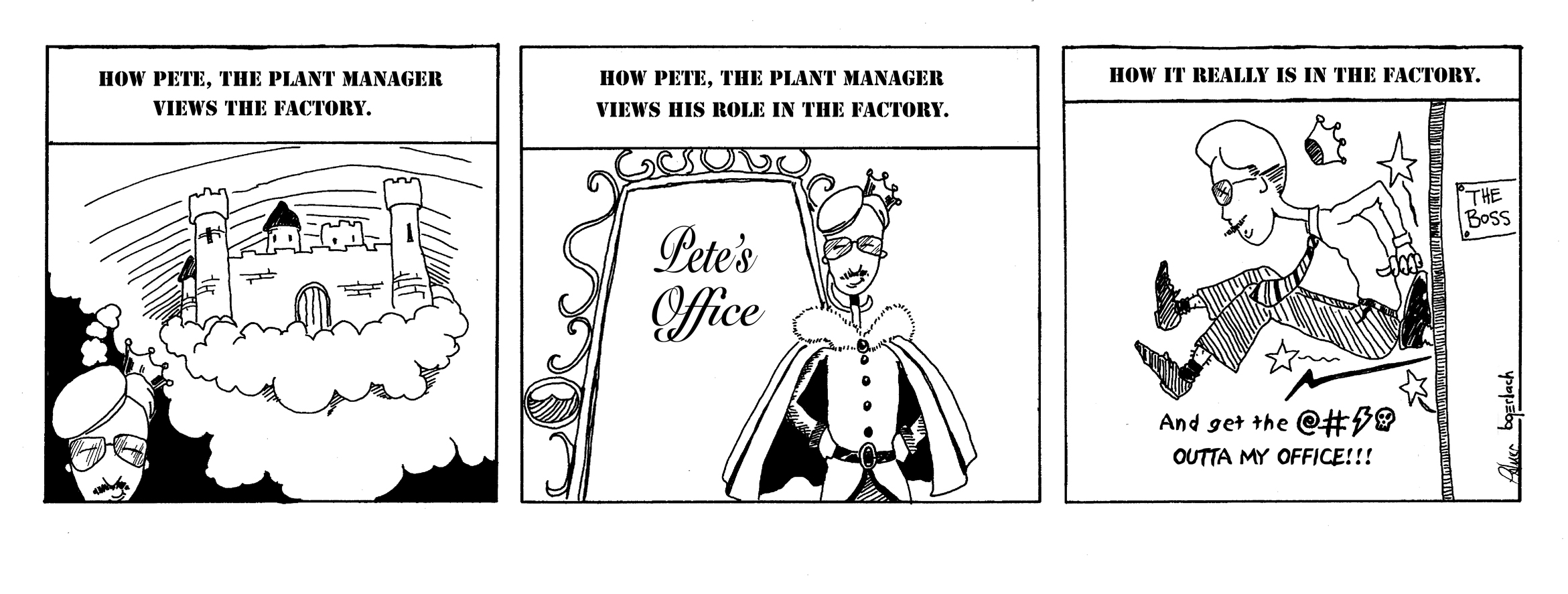 This is the 17th Pipedreams strip that Darin Palmer and I created quite some time ago. We would often look up at the ceiling office of the plant manager (name somewhat changed to protect the guilty) and think that he must be daydreaming about just what a hero he thought he was. We knew the truth.