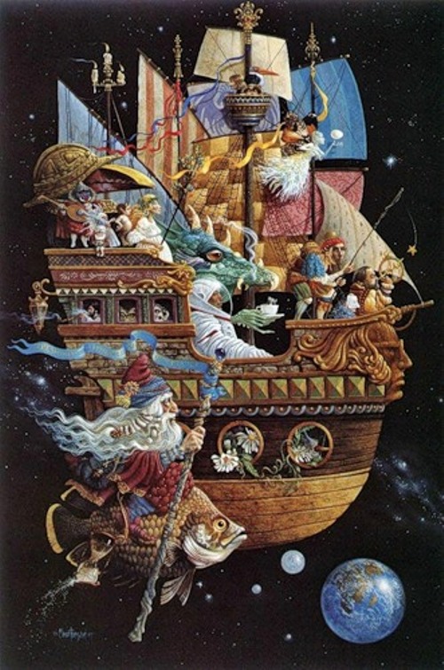 I was first introduced to the artwork of James Christensen when I was still in high school. I had only recently come to the realization that it was actually possible to draw and paint for a living. I poured over whatever publications I could find featuring amazing art and was particularly drawn to the work of artists like Norman Rockwell, Frank Frazetta and the Brothers Hildebrandt. Right there in the mix was this guy named Christensen who painted all sorts of quirky characters doing odd things, like flying a spaceship cobbled together from a flashlight, an eggbeater, powered by corroded Energizer batteries, all while wearing only a bomber jacket and a gas mask. I was hooked. I had never known that art could be so delightfully offbeat.