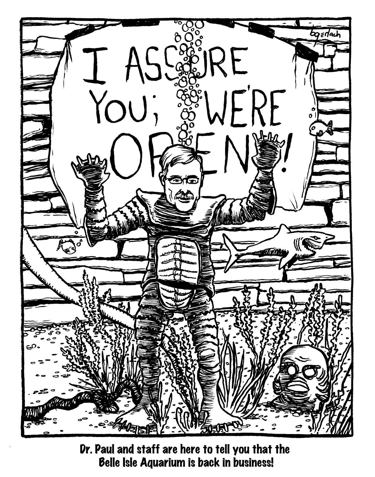 This cartoon sprang from a conversation with an aquarium alum about how the aquarium needs a tank with one of those cheesy Creature from the Black Lagoon thingies from home fish tanks. And a couple other film nods in there, as well.