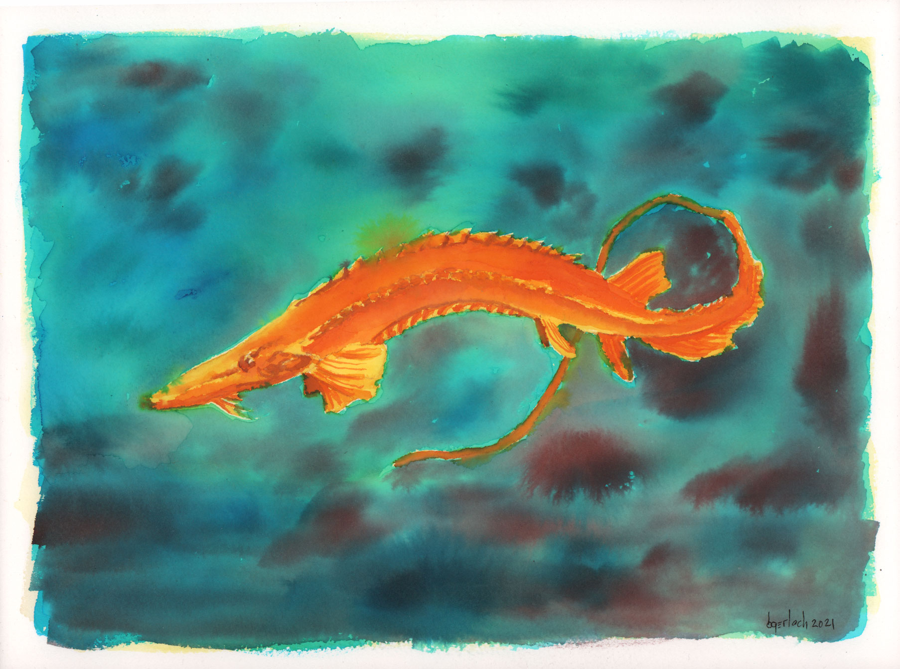 I have chosen the Syr Darya Shovelnose Sturgeon (from an earlier sketch), which is (hopefully) still alive in the Syr Darya River which flows through Uzbekistan and Tajikistan. The sturgeon was last seen in the 1960’s. You can see all of the ten fishes here.