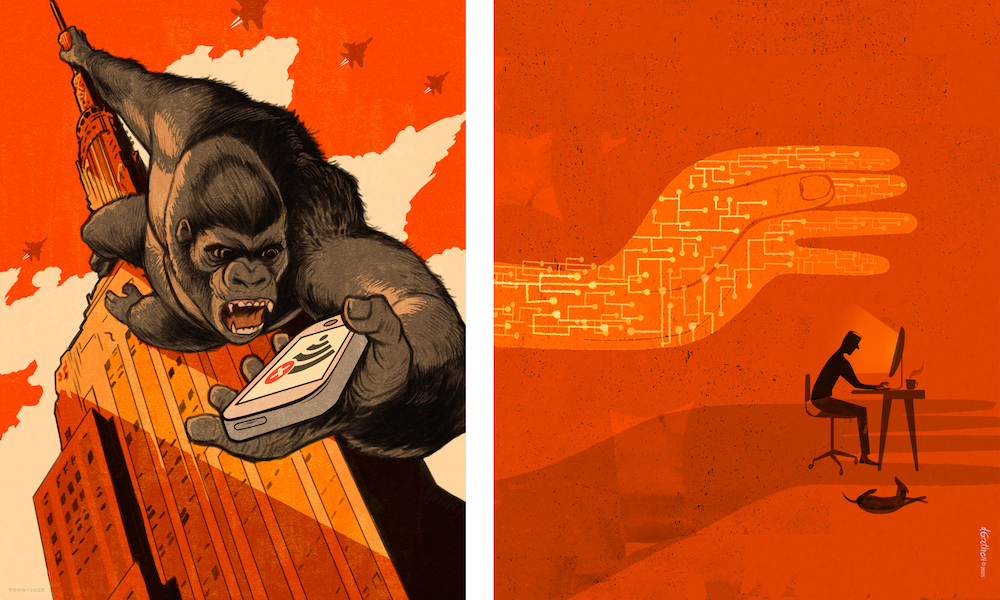 Working side by side, Donna and Paul have built parallel careers that reflect their unique artistic sensibilities. Donna’s versatile approach brings elegance and playfulness to editorial, publishing, and advertising projects, while Paul’s illustrations carry the cinematic flair of a lifelong love for monster movies, comic books, and history. Together, their studio is a place where contrasts coexist: delicate meets bold, motion meets stillness, imagination meets precision.